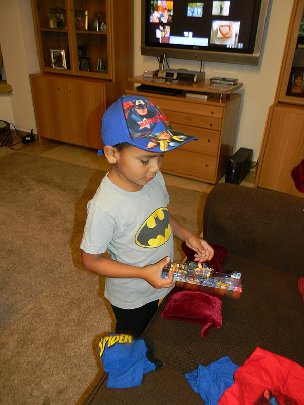 We decided to wait on opening the gifts from Santa, and start with opening the gifts from Mom and Dad instead.:) (Courtesy of ordering from Amazon. com and putting them in our yearly shipment). They are getting too fast at opening this year...I didn't get to snap all the gifts...